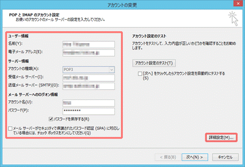 7.   POPIMAPのアカウント設定】の画面に戻ったら、「[次へ]ボタンをクリックしたらアカウント設定をテストする」のチェックが入っていることを確認した上で、[次へ]をクリックします。