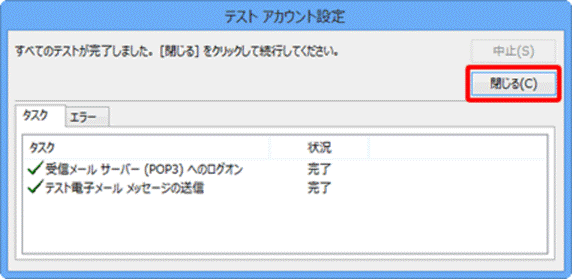 8.   【テスト アカウント設定】が開き、チェックが行われます。各タスクの状況が「完了」になれば、設定が正しく行われていることを示します。【閉じる】ボタンをクリックします。