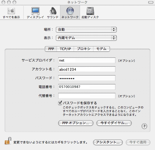 [電話番号]:アクセスポイントの電話番号 0570010987 を入力します。