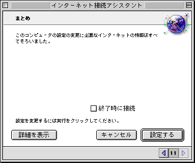 [まとめ]の画面では[終了時に接続]のチェックをはずし、[設定する]ボタンをクリックします。これで設定は完了です。