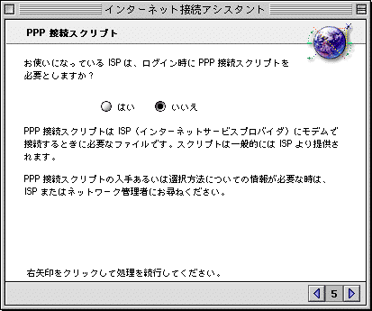 [PPP接続スクリプト]の画面では、[いいえ]にチェックを入れ、右矢印ボタンをクリックします。