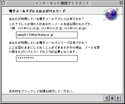 [電子メールアドレスおよびパスワード]の画面では、以下のように設定し、右矢印をクリックします。