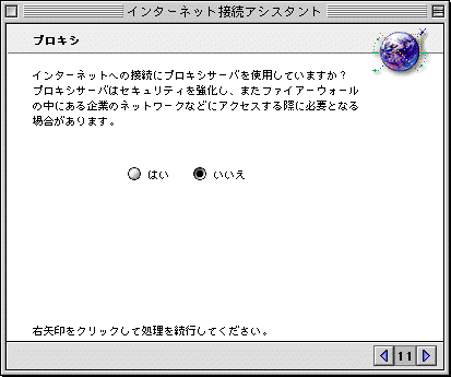 [プロキシ]の画面では、[いいえ]にチェックを入れ、右矢印ボタンをクリックします。