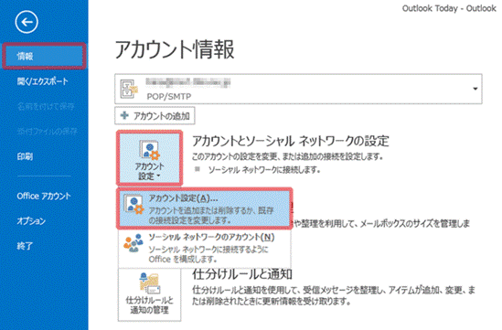 2.   【ファイル】<→【情報】→【アカウント設定】→【アカウント設定(A)】の順にクリックします