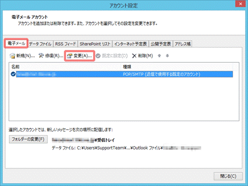 3.   【電子メール アカウント】が表示されます。変更したいメールアドレスを選択し、【変更(A)】をクリックします。