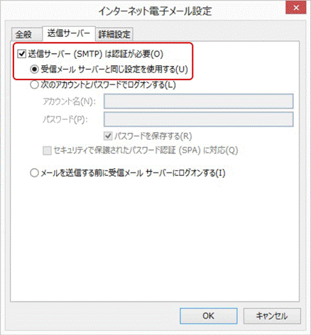 メールサーバーがセキュリティで保護されたパスワード認証 (SPA) に対応している場合には、チェック ボックスをオンにしてください