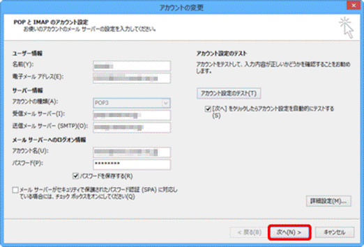 7.   POPIMAPのアカウント設定】の画面に戻ったら、「[次へ]ボタンをクリックしたらアカウント設定をテストする」のチェックが入っていることを確認した上で、[次へ]をクリックします。