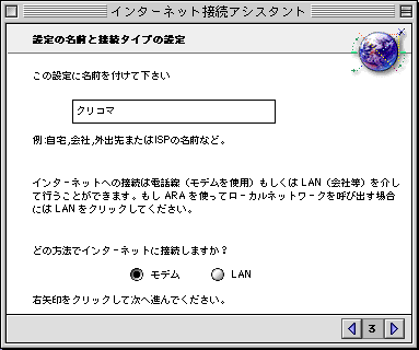 任意の接続名を入力し(ここでは、「クリコマ」と入力します)、[モデム]にチェックを入れて、右矢印ボタンをクリックします。