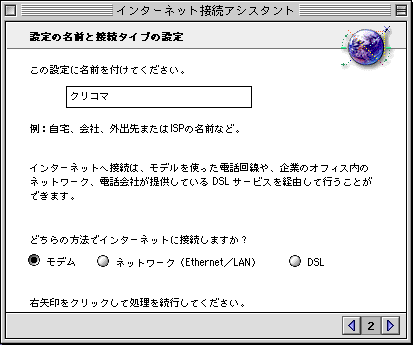 [設定の名前と接続タイプの設定]の画面では、[この設定に名前を付けて下さい]に任意の設定名を入力し(ここでは、「クリコマ」と入力します)、[モデム]にチェックを入れて、右矢印ボタンをクリックします。