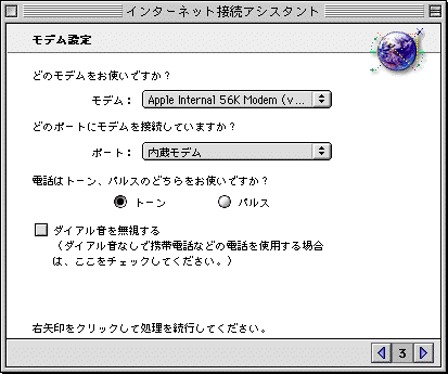 [モデム設定]では以下のように設定し、右矢印ボタンをクリックします。