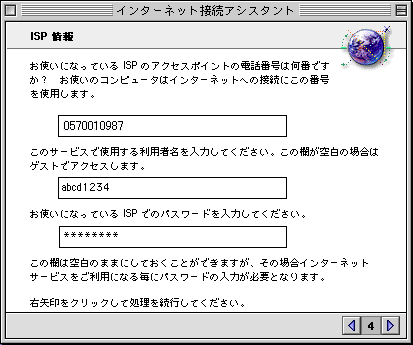 [ISP情報]の画面では、以下のように設定し、右矢印ボタンをクリックします。