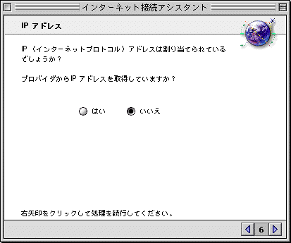 [IPアドレス]の画面では[いいえ]にチェックを入れ、右矢印ボタンをクリックします。