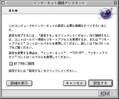 [まとめ]の画面では、[終了時に接続]のチェックをはずし、[設定する]ボタンをクリックします。これで設定は完了です。